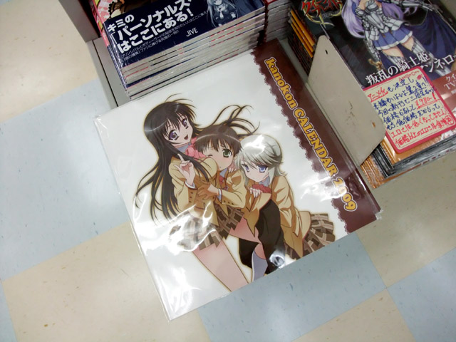ハゴロモ「かのこん 2009年カレンダー」が、12月頭には発売されています。これは、文字通り、DVD最終巻でオッパイ祭りだったりした、アニメ「かのこん」の2009年度版のカレンダー。コトブキヤラジオ会館のPOPで『毎月、けしからんイラストがイッパイ!!』と書かれていた通り、パンスト脱ぎかけ脱衣中なイラスト等も! 乳首はないですが、むねぽちはあり。