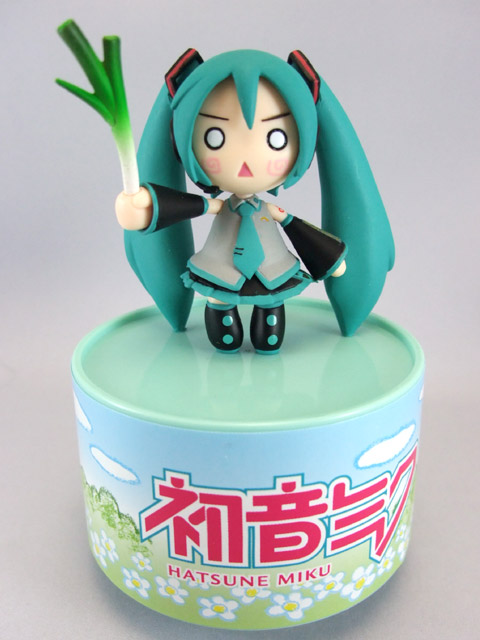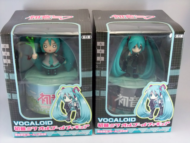 12月12日、セガプライズ「VOCALOID 初音ミク オルゴールフィギュア」が入荷していました。これは、ディフォルメ化された「初音ミク」と「はちゅねみく」のフィギュアを、それぞれ別の音楽が奏でられるオルゴールの上にのせたものです。はちゅねはもちろん?ネギをもった姿でした!原型制作はめーん氏(瓦礫屋)が担当。再生した様子の動画も掲載しました!