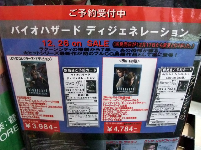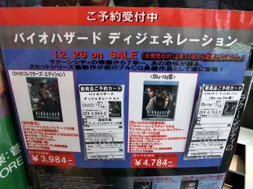 劇場版 バイオハザード ディジェネレーションの「DVD版」(AA)と「Blu-ray版」(AA)の発売が、12月26日に延期になったようで、ゲームシティで告知POPの変更が行われていました。