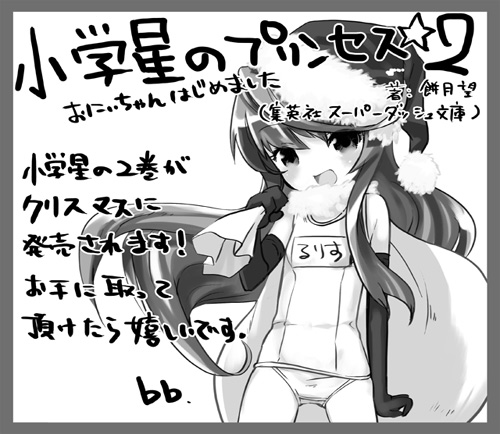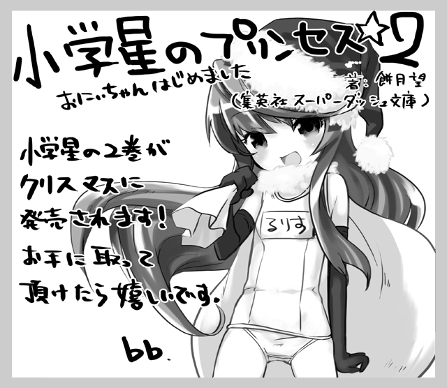 トップニュースbbさんが挿絵を担当されている、スーパーダッシュ文庫のライトノベル「小学星のプリンセス☆ 2 おにぃちゃんはじめました」が12月25日に発売です!bbさんから描き下ろしメッセージを頂いたので、本文に掲載しますね!