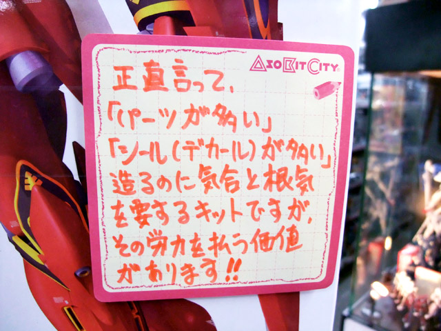 キャラシティのPOPでは『正直言って、「パーツが多い」「シール(デカール)が多い」造るのに気合と根気を要するキットですが、その労力を払う価値があります!!』と書かれていて、天井にはポスターも掲示。