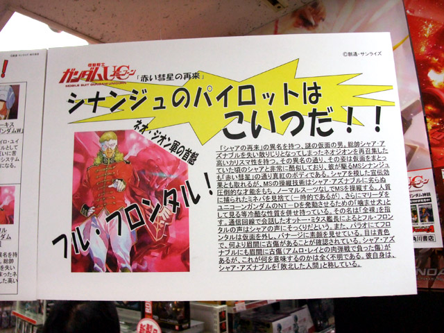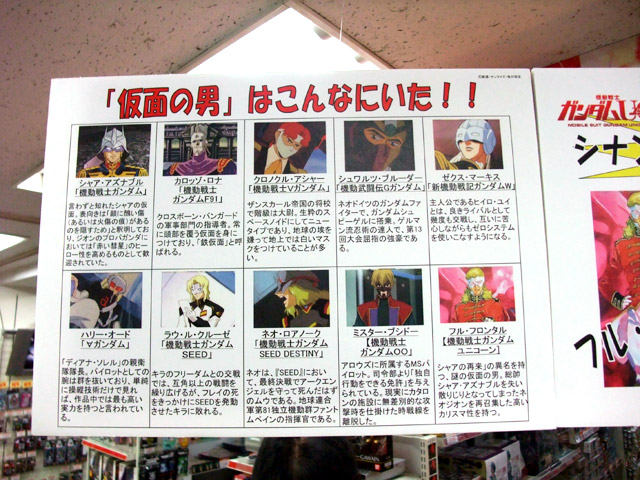 他、シナンジュのパイロット「フル・フロンタル」の紹介POPや、フル・フロンタルが仮面姿だからか、歴代ガンダムの仮面キャラの紹介POPなども掲示されていました。