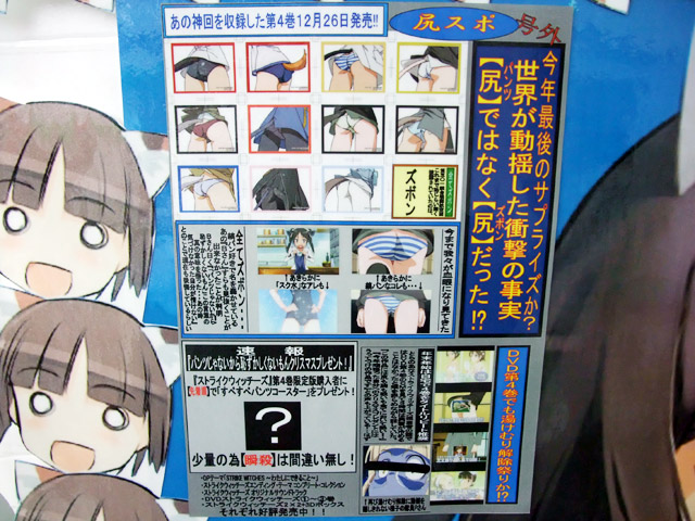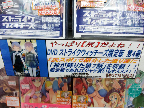 12月25日、DVD「ストライクウイッチーズ 4巻 限定版」が発売されました。今回は、「神回」といわれている第7話「スースーするの」が収録されています。その7話では、尻が、とっても、充実しているからか、とらのPOPでは『やっぱり【尻】だよね!!』と書かれていました。また、とらでは尻スポ号外で、パンツのようなものが「ズボン」である事実をスクープ?してました。