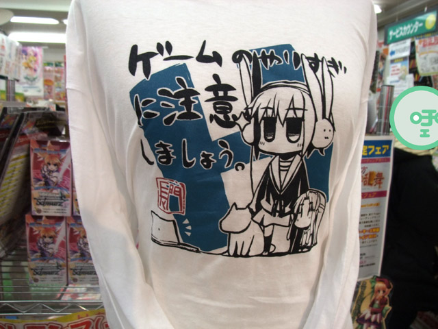 ゲーマーズ本店では、「ゲームのやりすぎに注意しましょう」と書かれたロングTシャツと、ブランケットのサンプルが展示されていました。