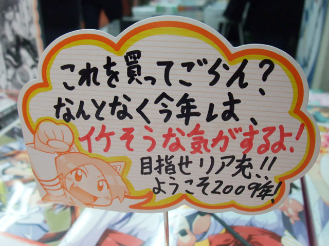 とらのあな1号店では、【これを買ってごらん?なんとなく今年はイケそうな気がするよ!目指せリア充!!ようこそ2009年!】とかかれたPOPが。