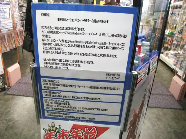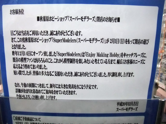 スーパーモデラーズが、2月1日で閉店となるそうで、店頭に【秋葉原ホビーショップ「スーパーモデラーズ」閉店のお知らせ】が出ていました。