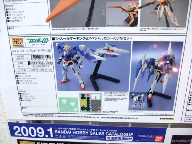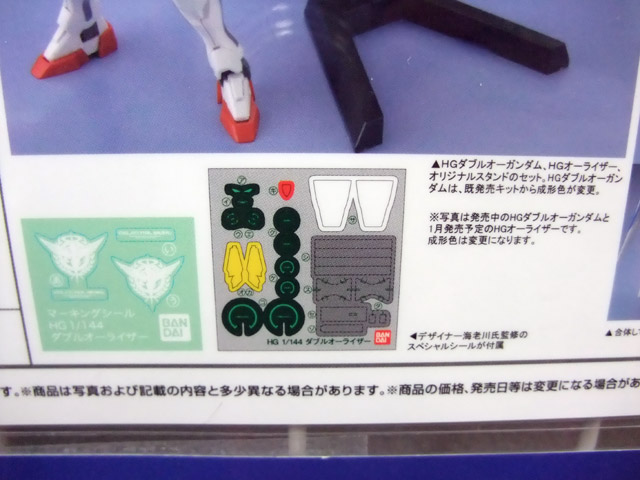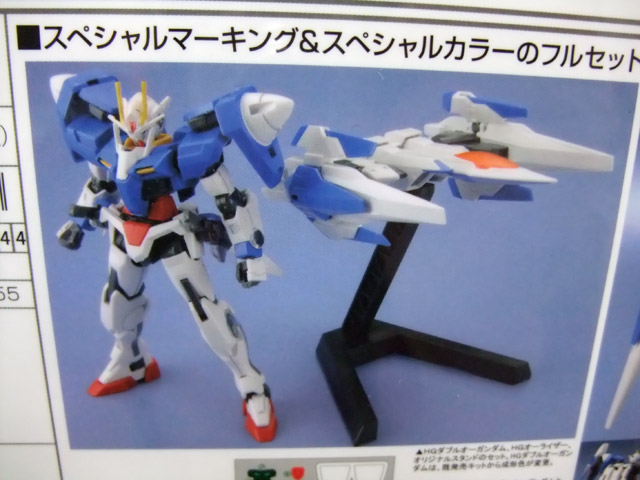 HGダブルオーガンダム、HGオーライザー、オリジナルスタンドのセット。HGダブルオーガンダムは、既発売キットから成型色が変更。デザイナー海老川氏監修のスペシャルシールが付属。