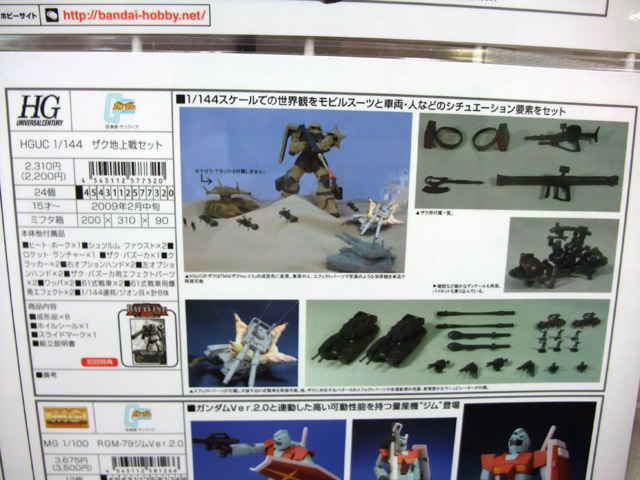 1/144スケールでの世界観をモビルスーツと車両・人などのシチュエーション要素をセット。HGUCのザクは「MGザクVer.2.0」の成型色に変更。車両や人、エフェクトパーツで世界観を単品で再現可能。