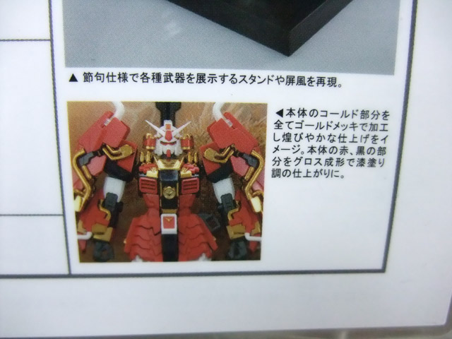 節句仕様で各種武器を展示するスタンドや屏風を再現。本体のゴールド部を全てゴールドメッキで加工し、煌びやかな仕上げをイメージ。本体の赤、黒の部分をグロス成形で漆塗り調の仕上がりに。