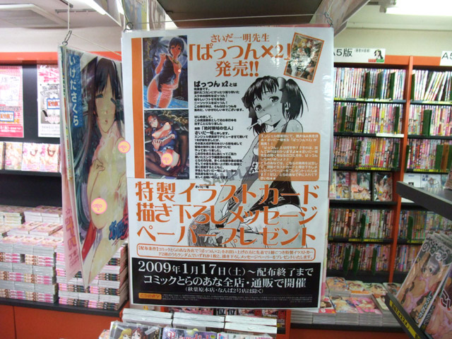 大人向けコミック「ぱっつん×2」が、1月15日に発売されました。これは、以前「鬼ノ仁の秘蔵っ子ついにデビュー!」 という告知POPをお伝えした、さいだ一明氏初の大人向けコミック。POPの説明で「絶対領域ニ侵入セヨ」とあるように、絶対領域=ニーソの中に発射とかも。他、机の角にすりつけ、ハダエプと合体とか、合体したままダイブとか、王道しっかりエロスでした!
