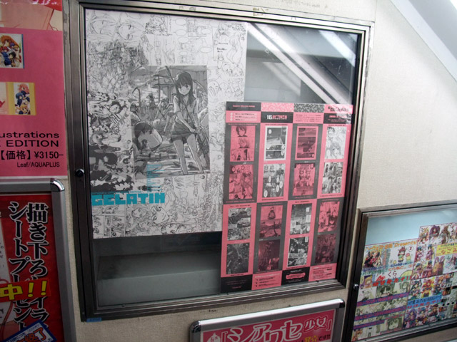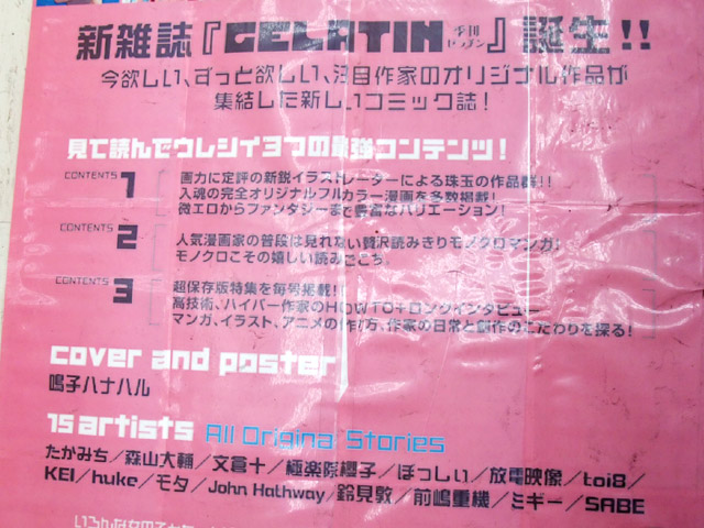 大人向けコミック誌「COMIC 快楽天」等を発行している、ワニマガジンから2月4日に発売予定のぼっしぃ氏、鳴子ハナハル氏、KEI氏、極楽院櫻子氏などが執筆予定の一般向け季刊コミック誌「GELATIN」ですが、ゲーマーズ本店にて、鳴子ハナハル氏描く表紙イラストを、メインの子が等身大くらいになるまで、超拡大して掲示していました!