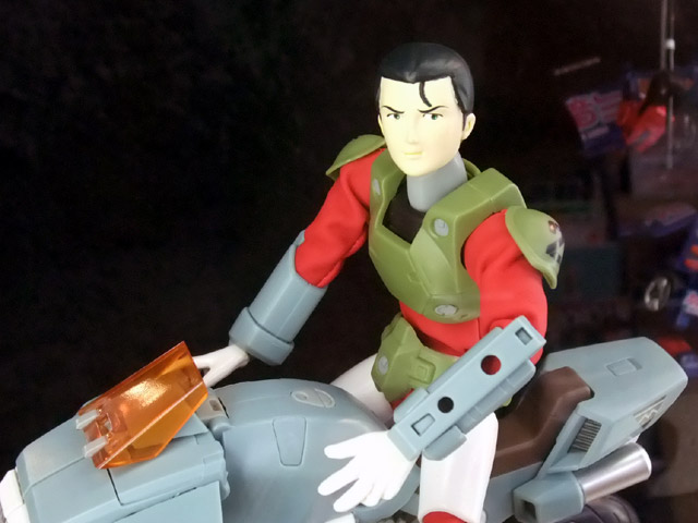 作品設定やアニメの細部を再現しつつ、実物のバイクや人間のフォルムを取入れ、従来のモスピーダ商品とは異なったアプローチで開発をしている。可変はもとより、アーマーサイクルと兵士フィギュアの対比に重点を置き、違和感のないライディングを可能にしている。また、ライディング・スーツのインナー(赤い部分)は布で再現し、よりリアルな仕上がりになる。専用ベースを使用すればライディングシーンや、ホバリング状態でのポージングも再現可能。