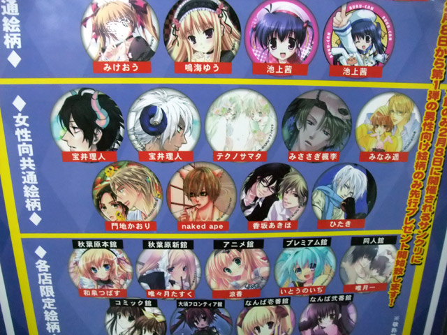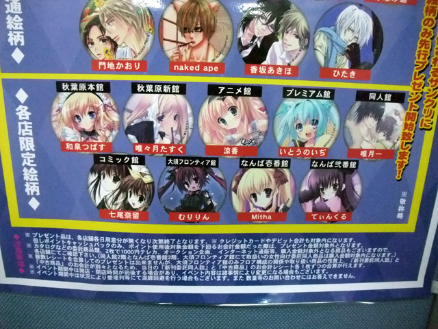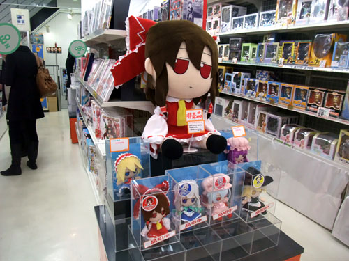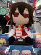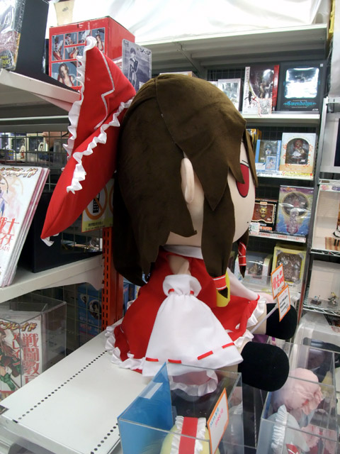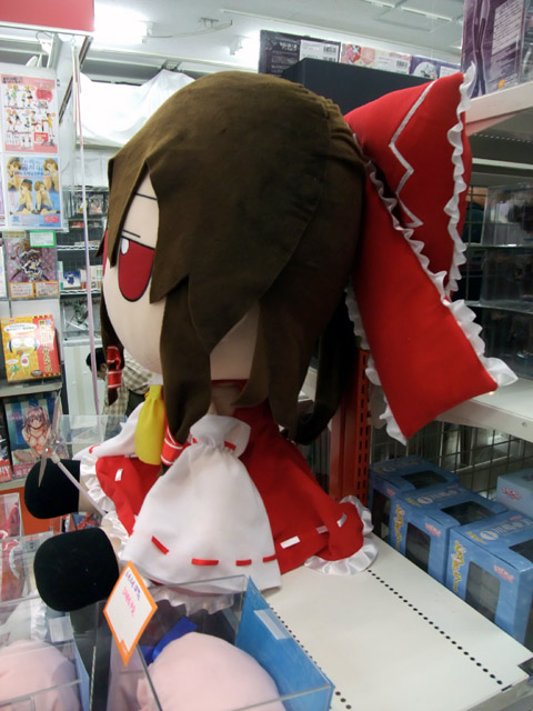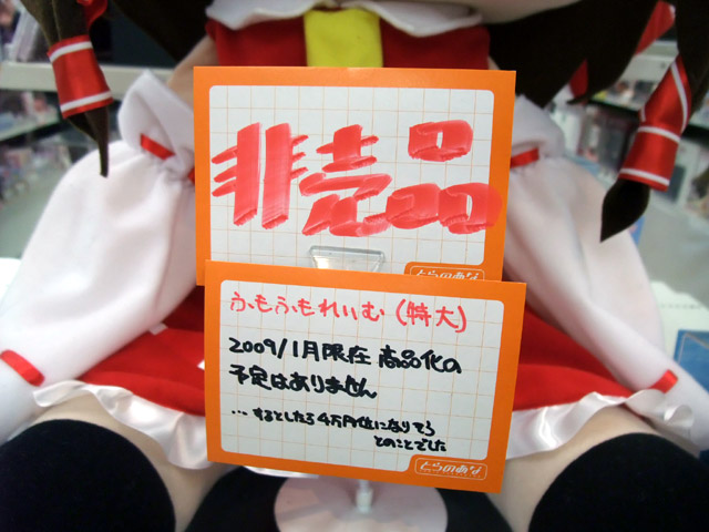 とらのあな本店にて、「ふもふも れいむ(特大)」が展示されていました。これはどうやら、Giftの「東方ぬいぐるみシリーズ」んぽ販促用のものみたいで、POPによると『非売品。2009/1月現在 商品化の予定はありません・・・するとしたら4万円位になりそうとのことでした』とのこと。他、K-BOOKSで、「トレ缶イベント」の告知ポスター掲示や、ミクフィギュア3種予約開始など。