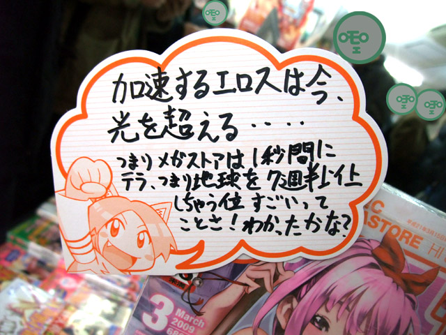 とら1号店のPOPによると『加速するエロスは今、光を超える・・・つまりメガストアは1秒間にテラ、つまり地球を7週半以上しちゃう位すごいってことさ!わかったかな?』と書かれていました。