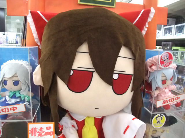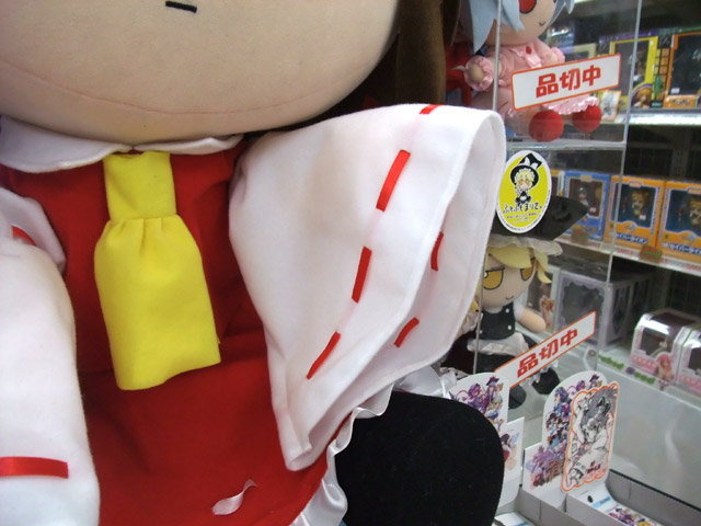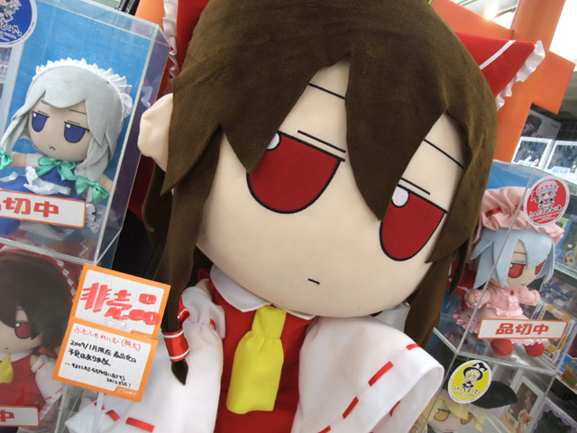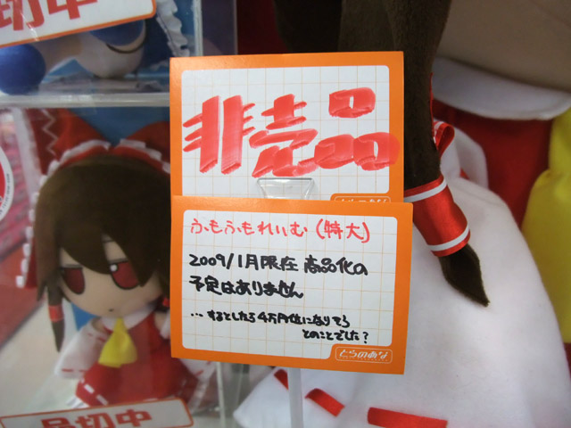以前、とらのあな本店での展示開始をお伝えした、2009年1月現在、商品化の予定はなく、商品化するとしたら4万円位になるらしい、おそらくGift製?の「ふもふも れいむ ぬいぐるみ(特大)」ですが、鳥居が追加で取り付けられていました。他、左手が不自然に持ち上がっていて、近くのPOPに『手をたたいてみる?』とあったのでたたいてみると・・・!?
