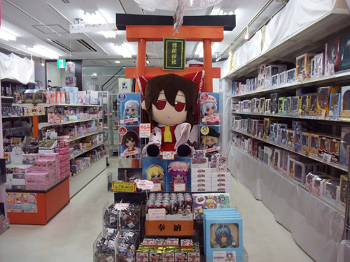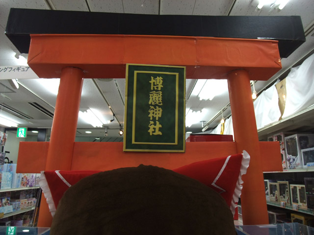 以前、とらのあな本店での展示開始をお伝えした、2009年1月現在、商品化の予定はなく、商品化するとしたら4万円位になるらしい、おそらくGift製?の「ふもふも れいむ ぬいぐるみ(特大)」ですが、鳥居が追加で取り付けられていました。