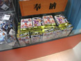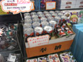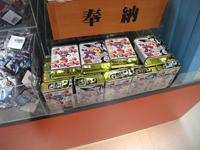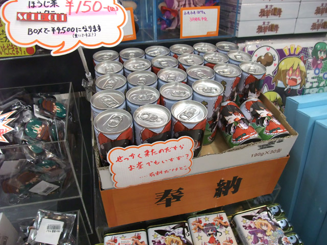 その周りには、POPで『せっかく来たのだからお茶でもいかが?・・・・有料だけど。』とされた、東方缶々制作委員会 東方缶々娘「霊夢(缶飲料・ほうじ茶)」「魔理沙(缶飲料・ミルクティー)」や、とらのあな「東方恋色飴」等の東方関連のグッズが並べられ、神社のお祭りのようなにぎやかさとなっています。