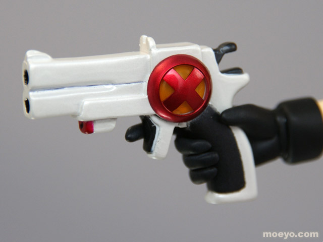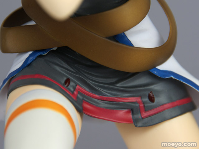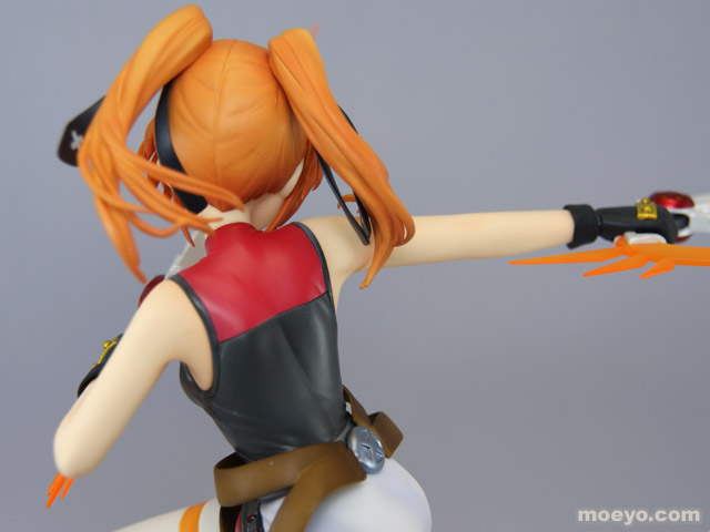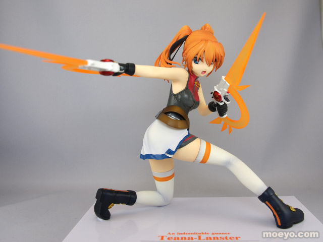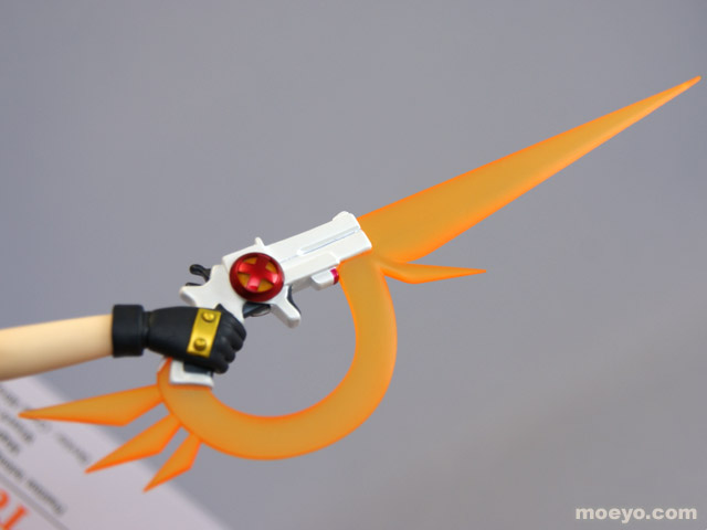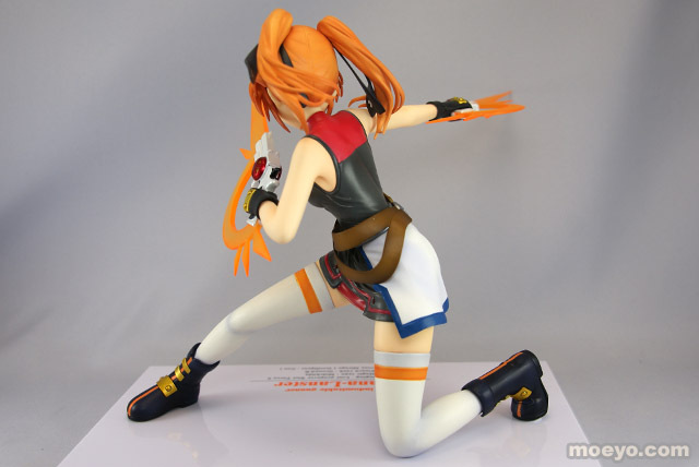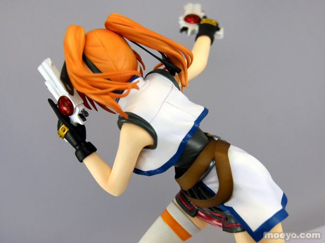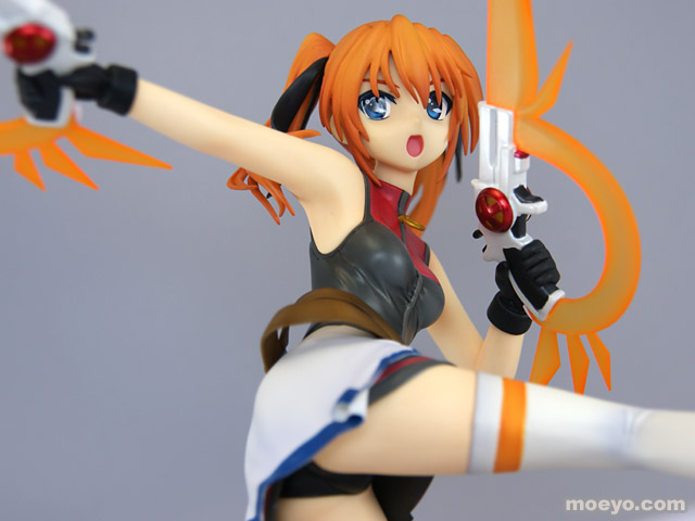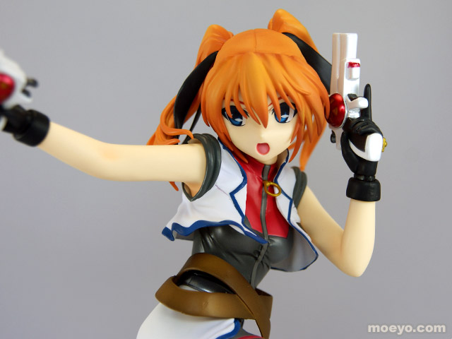 動きに合わせてなびくツインテールやはためく衣装、強い意志を感じさせる凛々しい表情、デバイス等の細部にいたるまで繊細な造型で見所満載。デバイスはガンモードとダガーモードの2形態再現でき、腕パーツも左右2組付属する。