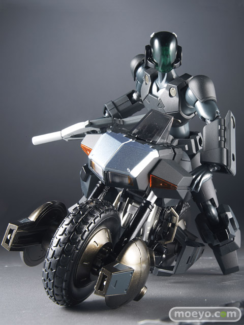 プロポーションを崩すことなく、可動と可変を再現した 「ヴァリアブルアクション」シリーズ「機甲創世記モス ピーダ」から昨年のイベント 限定品にて大好評をいただいた「ブラックモスピーダ」 に続き、今回は「ブラックブロウスーペリア」が登場! 物語の設定には存在しない漆黒の機体「ブラックブロ ウスーペリア」とは・・・。 黒をベースに各パーツで濃淡とつや、つや消しを使い 分けた塗装仕様。精悍な印象の仕上がりです。 さらに、ボーナスパーツとして、デテールアップシー ルが付属。好みのマーキングを選んで自由に貼ること ができます。各関節可動はもちろんのこと、バイクにも 搭乗可能。付属の台座で様々なポーズを再現できます。ヘルメットを外したキャラクターの素面も差替えヘッドとして付属。