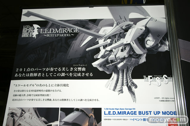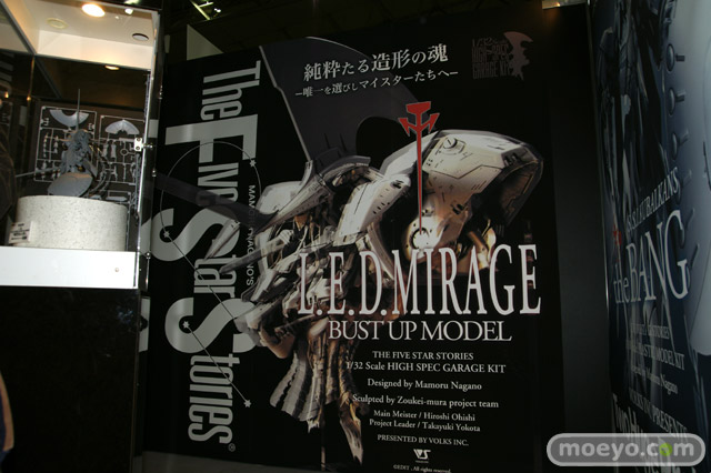 ■ 商品名:「THE FIVE STAR STORIES L.E.D. ミラージュ BUST UP MODEL」 ■ 仕様:ウレタン樹脂製組立キット ■ サイズ:1/32スケール 全高約700mm 横幅約550mm ■ 原型制作:大石凡氏(造形村FSSプロジェクトチーム)–> ■ 価格:税込98,000円(イベント会場価格) ■ 発売:2009年5月下旬頒布開始(一次・二次予約分) |