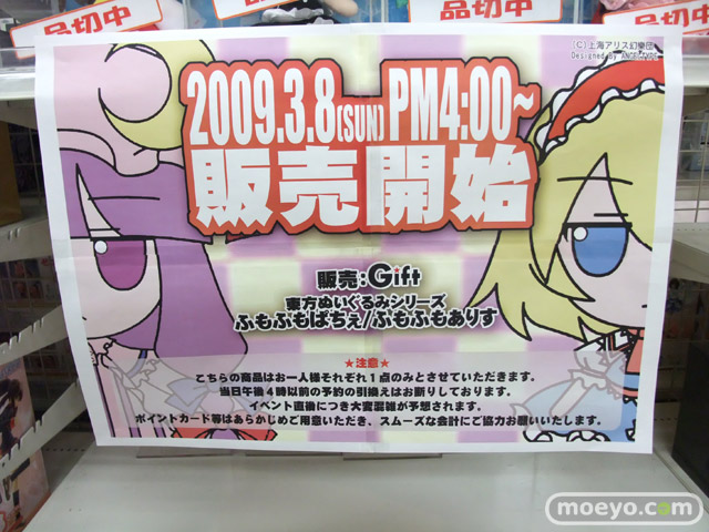 ぷちアキバ情報3とらのあな本店で、Gift「東方ぬいぐるみシリーズ ふもふもぱちぇ/ふもふもありす」の告知掲示開始!3月8日(日) PM4:00~販売開始だそうです。