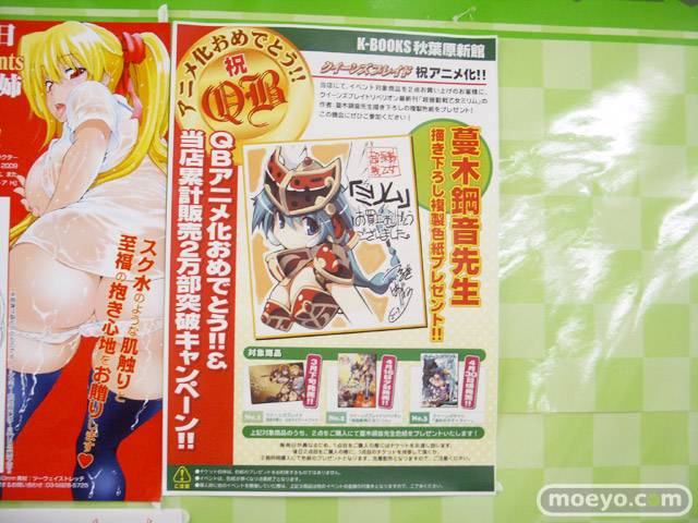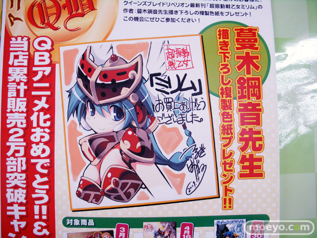 「クイーンズブレイド 超振動戦乙女ミリム」と、「クイーンズゲイト 運命の子 ディズィー」の告知POPが、とら本店で掲示開始。K-BOOKSでは複製色紙プレゼントの「QBアニメ化おめでとう!&当店累計販売2万部突破キャンペーン」告知が。