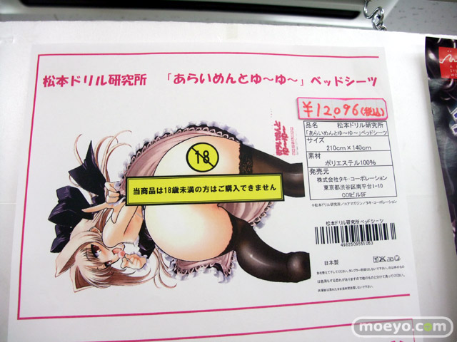 タキ・コーポレーションのベッドシーツ「松本ドリル研究所 あらいめんとゆーゆー」、「鬼ノ仁 個人授業」の2種が、とらのあな本店5Fホビーフロアにて発売されました。サンプルも届いているのですが、「エロすぎてサンプルが飾れません。」とのこと。