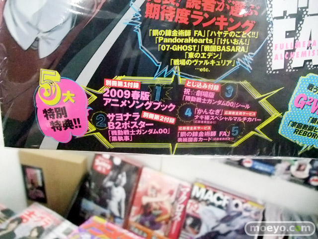 ■ 価格:税込550円 ■ 付録: 別冊 2009 SPRING ANIME SONG Collection 「機動戦士ガンダム00」「黒執事」B2ポスター 「機動戦士ガンダム00」祝放映終了&劇場化決定記念シール 「かんなぎ』ナギ様スペシャルマルチカバー 応募者全員サービス 「鋼の錬金術師 FULLMETAL ALCHEMIST」表紙図書カード 応募者全員サービス |