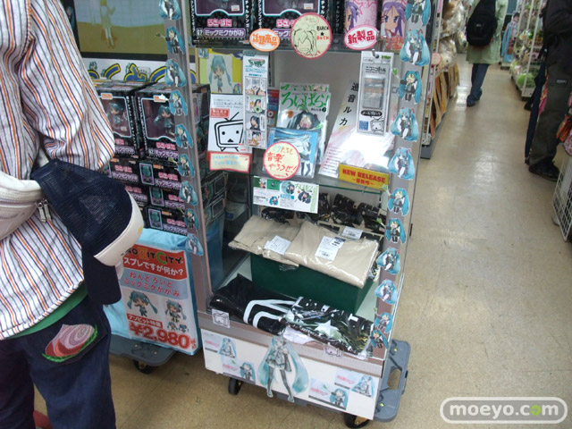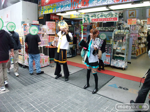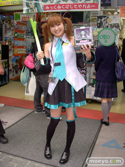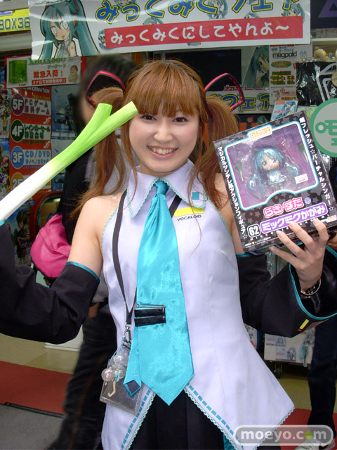 5月16日、ゲームシティ店頭で、初音ミク関連のグッズなどの店頭販売イベント「みっくみくフェア」が開催され、初音ミクと鏡音レンのコスプレさんが呼び込みをしていました。コスプレさんはガチで店員さんらしく、ネギももってました。