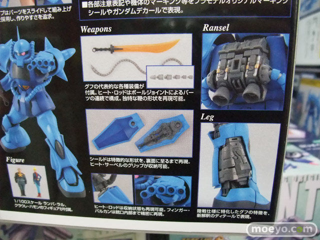 改良強化新型グフ Ver.2.0で再び登場。サイドアーマーはフロントアーマーと連動し後方へスライド。ヒート・ロッドは球体ジョイントの連続で再現。節の毎に可動。1/100サイズのランバ・ラル、クラウレ・ハモンの精密フィギュアが付属。コクピットハッチはスムースに開閉、着座のパイロットフィギュア付属。