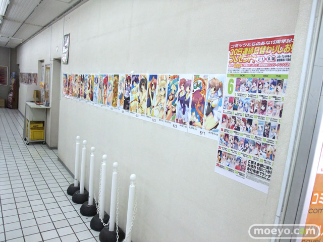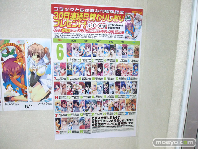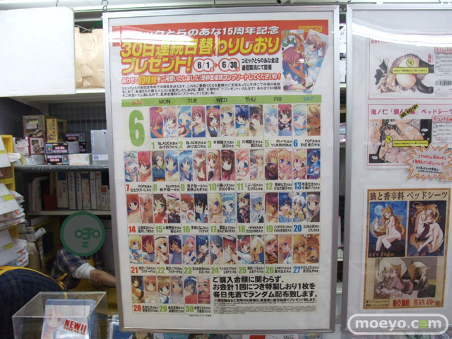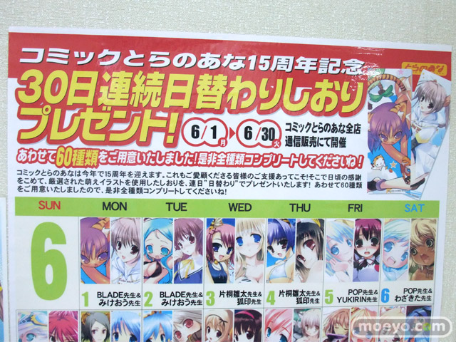 コミックとらのあなの15周年記念として、2009年6月1日~30日まで、会計1回につき1枚もらえる「30日連続日替わりしおりプレゼント」が実施されます!とらのあな1号店では、その30日×2種の全60種全部の絵柄を拡大して掲示していました!
