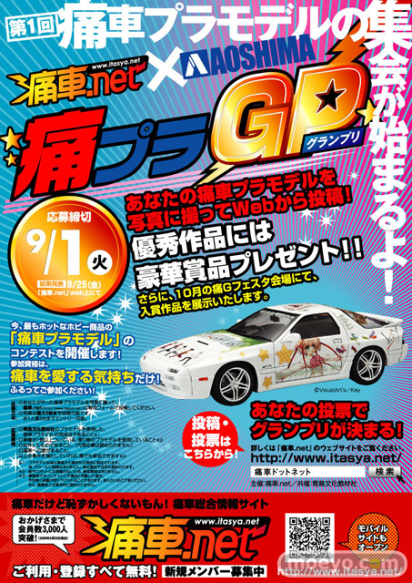 痛車の「アオシマ」と、国内最大の痛車コミュニティサイト「痛車.net」がタッグを組んで、至上初のインターネット上でのプラモデルコンテスト「痛プラGP」が開催されることが決定。このコンテストは「アオシマ」の商品であれば、改造に制限はなく(ただし、車輪のあるプラモデルに限る)、今回デカールにも制限が設けられておらず、他社製品での応募も認められているという非常に自由度の高いプラモデルコンテストとなっています。