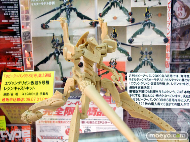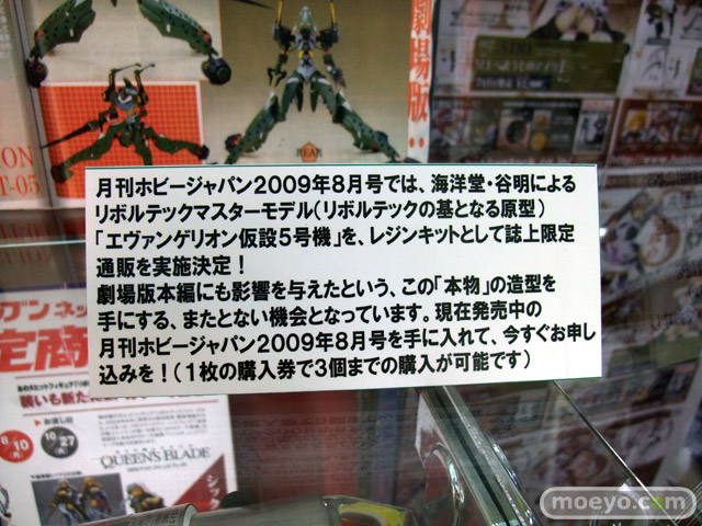 月刊ホビージャパン2009年8月号では、版権元ならびに海洋堂の特別協力により、谷明によるリボルテックマスターモデル「エヴァンゲリオン仮設5号機」を、レジンキットとして誌上限定通販する。劇場版本編にも影響を与えたというこの「本物」の造形を手にする、またとない機会となっている。月刊ホビージャパン2009年8月号を手に入れて、今すぐお申込みを!(1枚の購入券で3個までの購入が可能です)