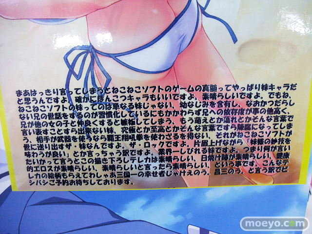 まあはっきり言ってしまうとねこねこソフトのゲームの真髄ってやっぱり妹キャラだと思うんですよ。確かにぽんこつキャラもいいですよ。素晴らしいですよ。でもね、ねこねこソフトの妹ってのは単なる妹じゃない、幼なじみを含有し、なおかつだらしない兄の世話をするのが習慣化しているにもかかわらず兄への依存度が事の他高く、兄が他の女の子と仲良くすると嫉妬してしまう、もう萌えとか蕩れとかそんな言葉で言い表す事すら出来ない妹、究極とか至高とかそんな言葉ですら陳腐になってしまう、相手が武器を使うなら覇王翔吼拳を使わざるを得ない、それがねこねこソフトが世に送り出すザ・妹なんですよ。ザ・ロックですよ。片眉上げながら「妹様の妙技を味わうが良い」とか言っちゃう訳ですよ。業界一しびれる妹ですよ。つまり何が言いたいかって言うとこの描き下ろしテレカは素晴らしい、日焼け跡が素晴らしい、健康的エロスが素晴らしい、素晴らしいと言ったら素晴らしい、という事です。こんなテレカの絵柄もらえてわしゃあ三国一の幸せ者じゃけえのう。昌三のう。と言う訳でビシバシご予約お待ちしております。