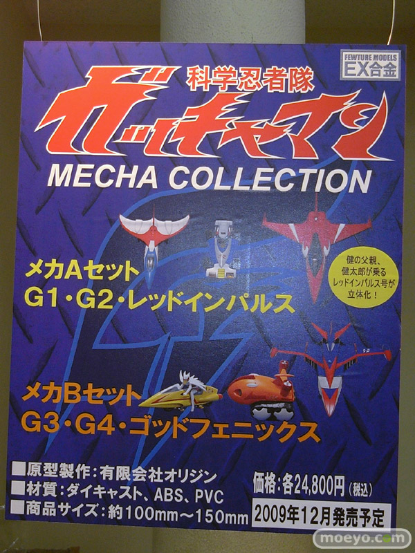 ■ 商品名:「EX合金 ガッチャマン メカコレクションBセット ゴッドフェニックス・G-3号・G-4号」(AA)(AM) ■ 販売元:アート・ストーム ■ 販売元:グッドスマイルカンパニー ■ 仕様:彩色済みダイキャストモデル ■ サイズ:ゴッドフェニックス/全長 約185mm、G-3号/全長 約120mm、G-4号/全長 約115mm ■ 原型制作:有限会社オリジン ■ 価格:税込24,800円 ■ 発売: 2009年12月 |