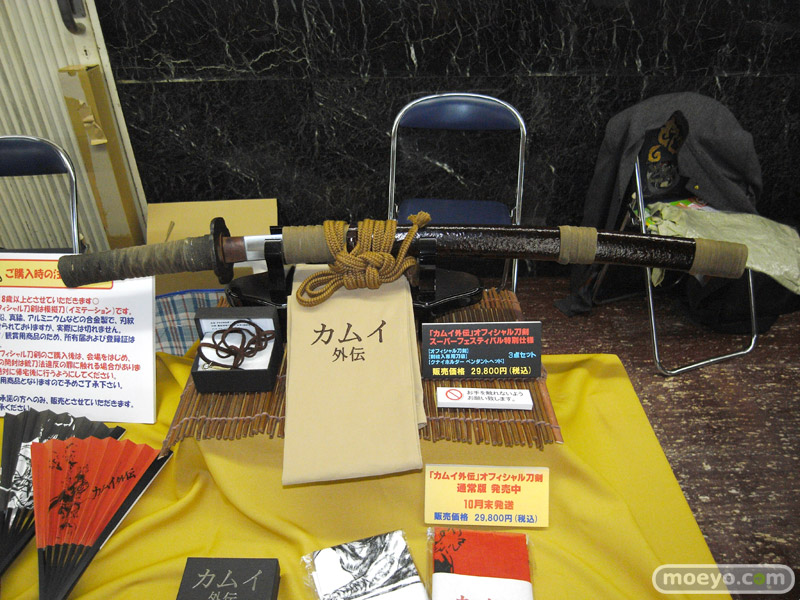 ■ 商品名:「カムイ外伝 オフィシャル刀剣 スーパーフェスティバル特別仕様」 ■ 発売元:ゼスト ■ 仕様:刺繍入り専用刀袋 クナイホルダー ペンダントヘッド 3点セット ■ サイズ:1/1スケール ■ 価格:税込29,800円 |