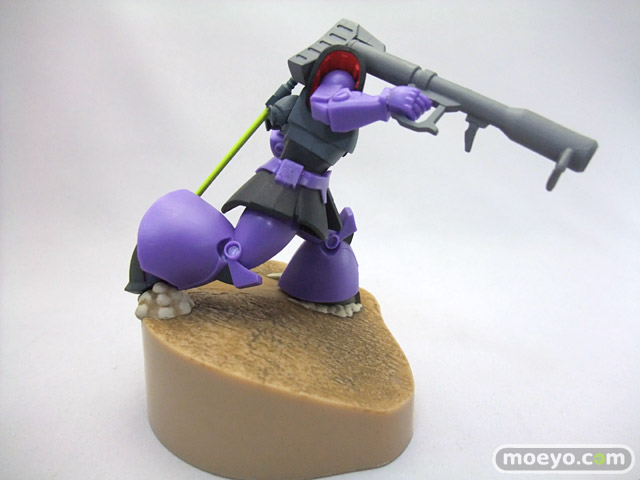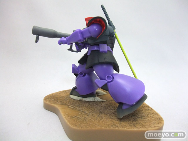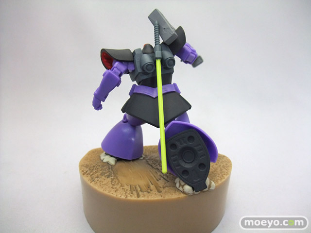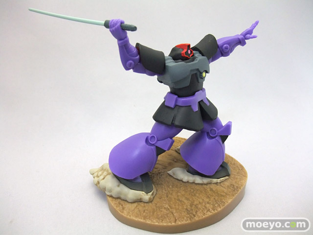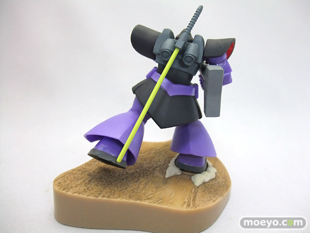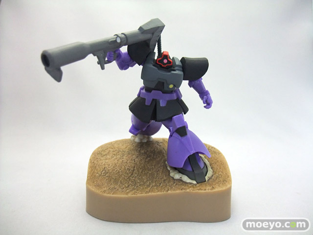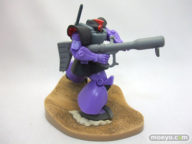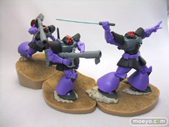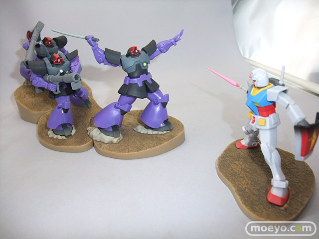 「ガイア」「マッシュ」「オルテガ」の搭乗する「ドム」3機と、それに対峙する「ガンダム」をフィギュアで再現しました。「ドム」による攻撃フォーメーション「ジェットストリームアタック」を再現できます。