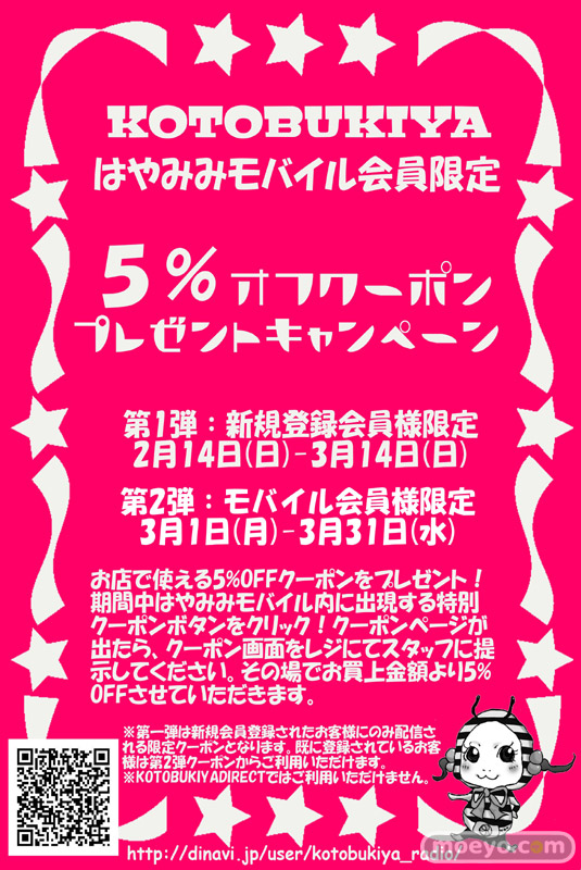 2月14日~3月14日の期間に、コトブキヤのはやみみモバイルに新規会員登録すると「5%オフクーポン」がプレゼントされるキャンペーンが、本日2月14日より開始です!すでに会員になっている人にも3月1~31日配布予定!