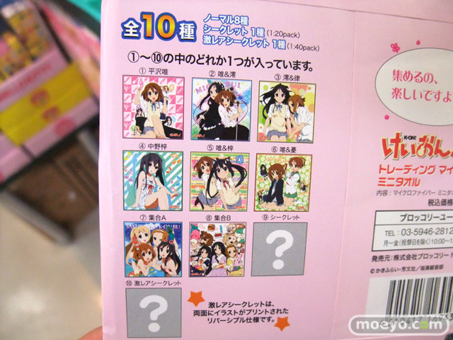 ■ 商品名:「けいおん! トレーディングマイクロファイバーミニタオル」 ■ 発売元:ブロッコリー ■ 仕様:マイクロファイバーミニタオル ■ サイズ:タオルサイズ約200mm×200mm ■ ラインナップ:全10種類(ノーマル8種・シークレット1種・激レアシークレット1種) ■ 価格:1BOX20個入り 税込12,000円/1パッケ税込600円 |