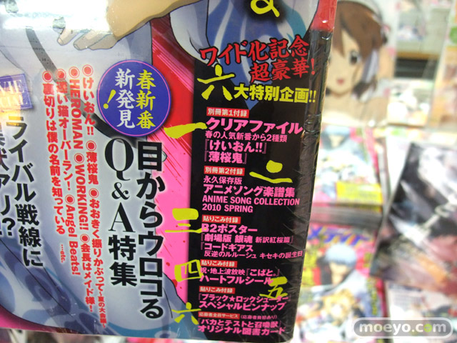 ■ 価格:税込620円 ■ 特典: 別冊第1付録 クリアファイルセット けいおん!!/薄桜鬼 別冊第2付録 ANIME SONG Collection 2010 SPRING 貼りこみ付録 B2ポスター 劇場版 銀魂 新訳紅桜篇/コードギアス 反逆のルルーシュR2 貼りこみ付録『こばと。』ハートフルシール 貼りこみ付録『ブラック★ロックシューター』スペシャルピンナップ 応募者全員サービス『バカとテストと召喚獣』オリジナル図書カード |