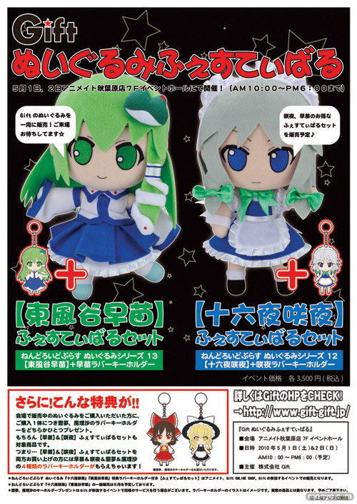 Giftの「ぬいぐるみふぇすてぃばる」が5月1・2日に、秋葉原のアニメイトにて開催されます。「東方ぬいぐるみ」「ねんどろいどぷらすぬいぐるみ」等、人気シリーズの新作も含め 一挙に展示される他、会場購入特典や、クリアファイルの無料配布も!