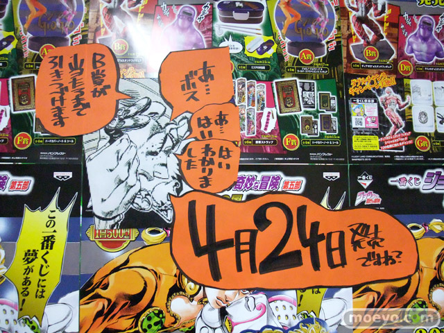 バンプレスト「一番くじジョジョの奇妙な冒険 第五部 黄金の風」が、4月24日にアキバの取り扱い店舗で発売!これは、一回500円の空くじ無しのくじ引きで、A~G賞までラインナップ。中でもD賞「アバッキオ’sスタンドクロック」が人気みたいです。