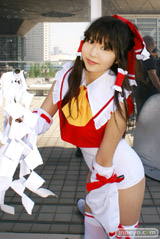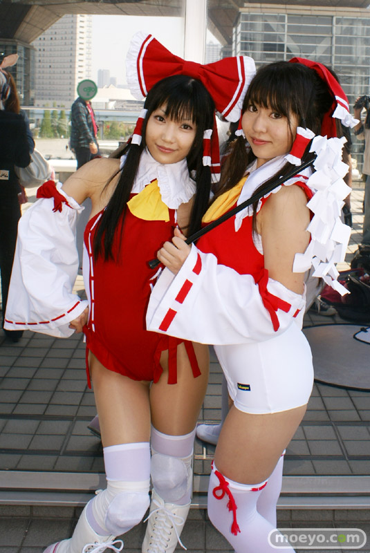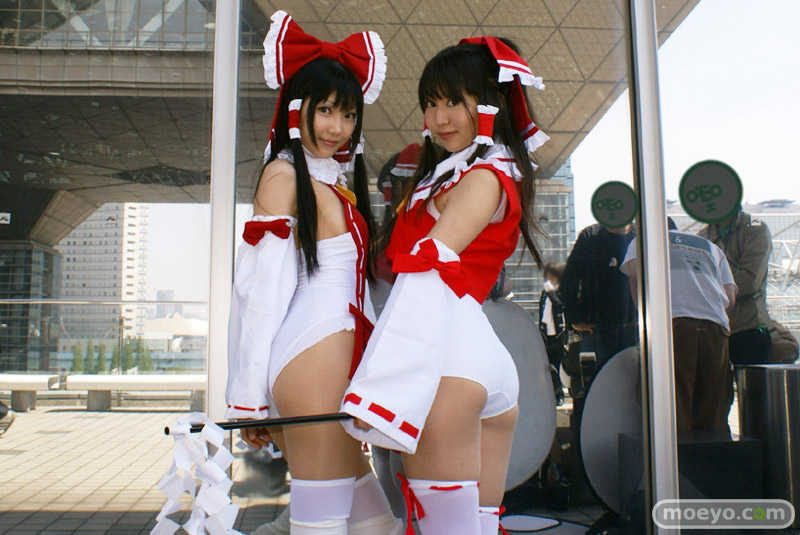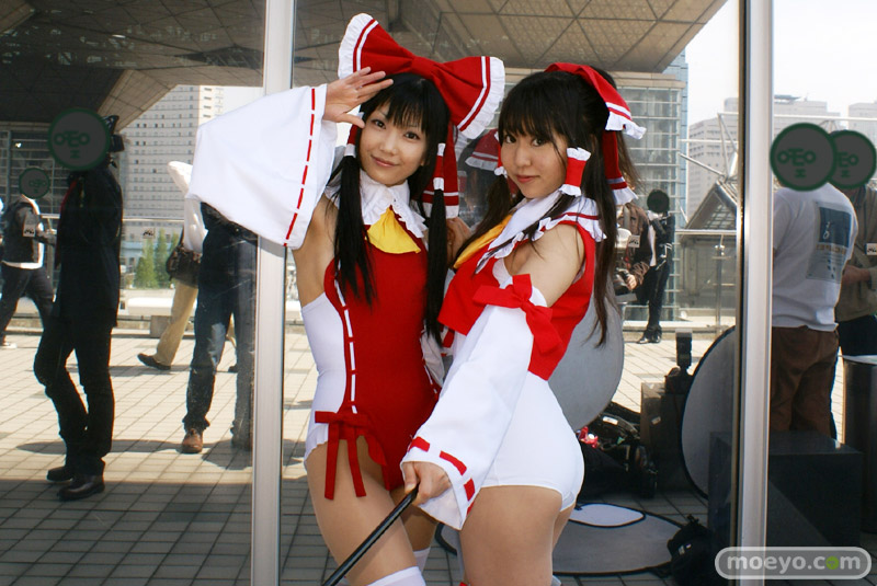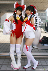 「DreamParty東京2010春」と同時開催のあった「ビッグコスプレ博」。大勢の東方Projectコスプレイヤーさんがいた中で、こちらのお二人はスク水×博麗霊夢という大胆なアレンジコスプレをされていました!霊夢の衣装とスク水が絶妙にマッチ!