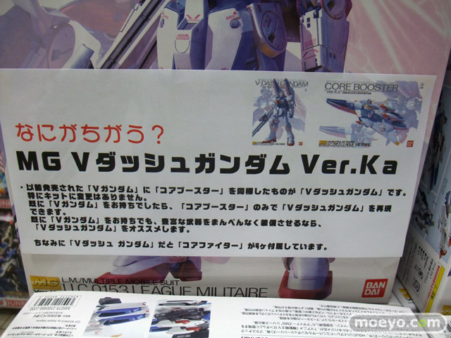 以前発売された「Vガンダム」に「コアブースター」を同梱したものが「Vダッシュガンダム」です。特にキットに変更はありません。既に「Vガンダム」をお持ちでしたら、「コアブースター」のみで「Vダッシュガンダム」を再現できます。既に「Vガンダム」をお持ちでも、豊富な武器をまんべんなく装備させるなら、「Vダッシュガンダム」をオススメします。ちなみに「Vダッシュガンダム」だと「コアファイター」が4ヶ付属しています。