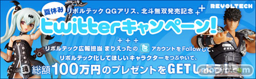 上記アイテムの発売を記念して、2010年7月24日(土)より『夏休みTwitterキャンペーン』を開催いたします。弊社リボルテック広報担当まりえったのTwitterアカウント(https://twitter.com/hs_marietta)をFollowして、専用サイトからリボルテック化してほしいキャラクターをつぶやくと、抽選で総額100万円のプレゼントが当たるキャンペーンです。