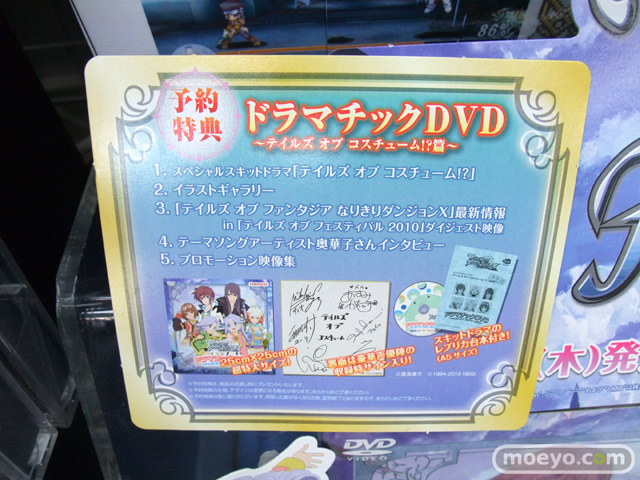 ■予約特典の「ドラマチックDVD~テイルズ オブ コスチューム!?篇~」オリジナルスキットドラマに、ヴェスペリアからユーリとリタ、グレイセスからアスベル、パスカルが参戦!その他、さまざまなコンテンツを収録し内容満載なDVDはサイン入りの25cmのジャンボパッケージです。