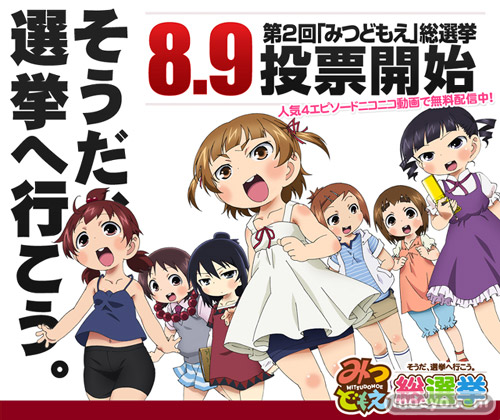 第2回『みつどもえ総選挙』投票がいよいよ8月18日で締め切り!今回は、第4話~第6話の中から好きなエピソードに投票するもので、1回目同様、人気4エピソードをニコニコ動画にて2週間限定無料配信!