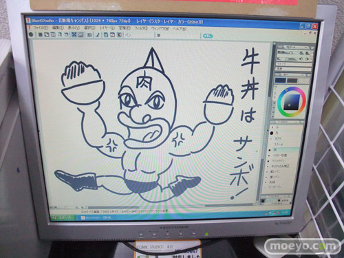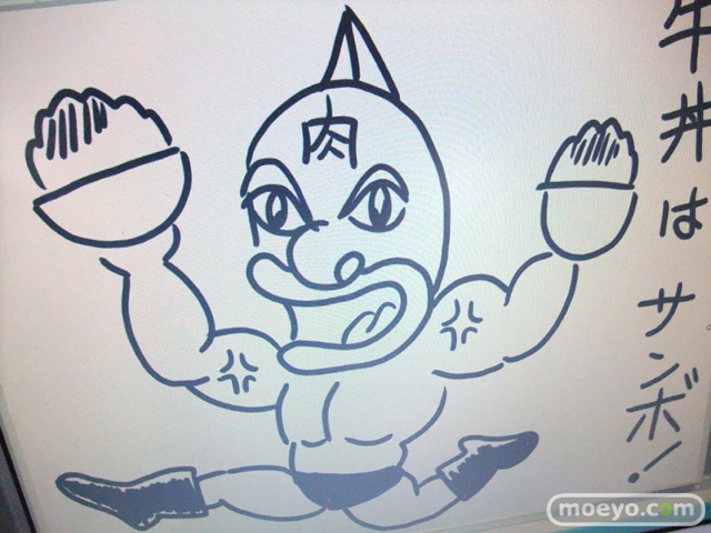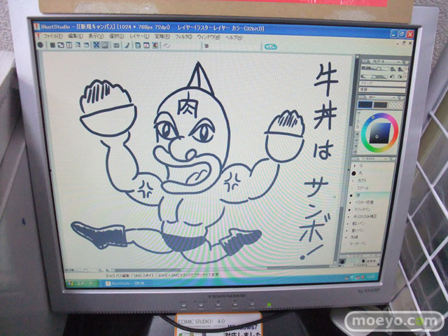 K-BOOKSでは、PC用のお絵かきツール「コミックスタジオ」のデモ機が常設されています。8月19日になんとなく画面を覗いたら、キン○マンが「牛丼はサンボ!」と叫んでいました。店員さんにお伺いしたら、たまにささっと書かれる方がいるようです!
