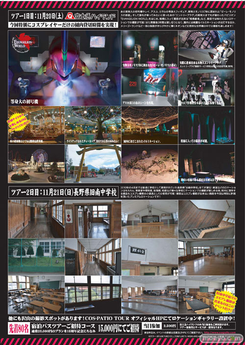 一日目は「富士急ハイランド」で遊園地施設をほぼコスプレ全面開放で楽しみ、(業界初!18:00~20:00のナイトロケーションタイムはナント全面貸切!!)二日目は長野県の「旧南中学校」(2010年4月まで学校として実際に使用)を、こちらも全面貸切で学校ロケーションを思いっきり楽しんじゃう、貸切づくしの何とも贅沢なコスプレイベント!1泊2日通常価格”25,000円”のコスプレバスツアーを、そこは15周年記念ということで、コスパ”10,000円”負担の”15,000円”でご招待!! (先着80名様限定)コスパが考える最高の楽しさを是非ご堪能あれ♪