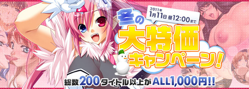 DMMアダルトから、クリスマスプレゼント&お年玉!「冬の大特価キャンペーン」として、総数245タイトルの美少女ゲーム(同人ゲームではありません)を1000円の大特価で販売中!2011年1月11日 まで毎日が『”性”なる夜』だぜ!